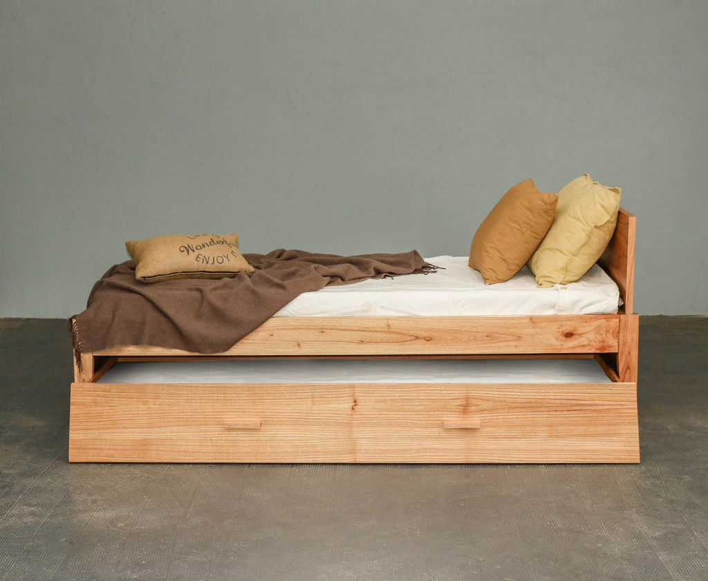 Cama de 1 plaza con carro realizada en madera maciza de paraíso. Tratamiento poliuretánico.